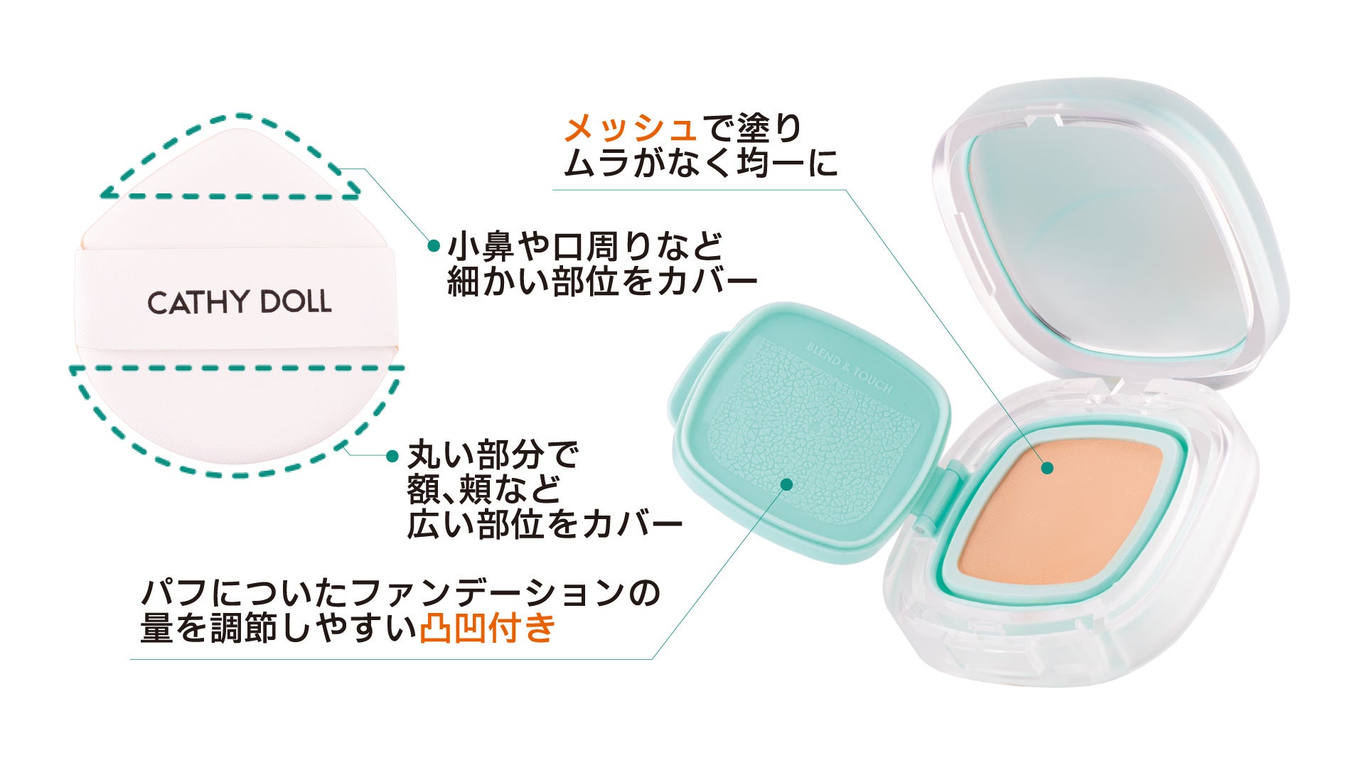 雲のように柔らかい水滴型パフを採用。小鼻や目の周りなど細かな部分まで塗布しやすく、ファンデーションがなめらかに伸び広がるのに役立ちます。