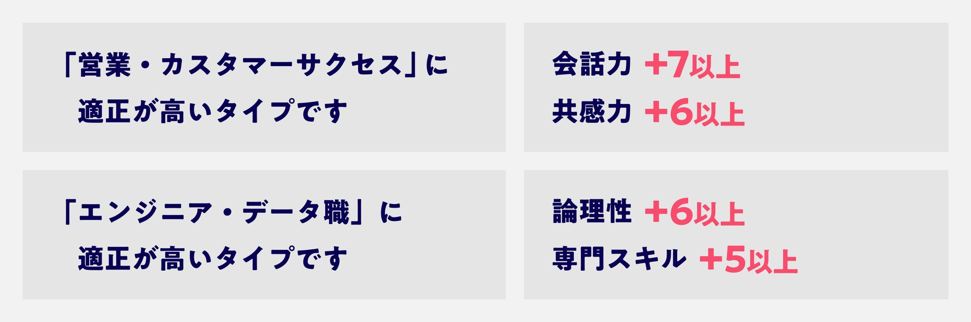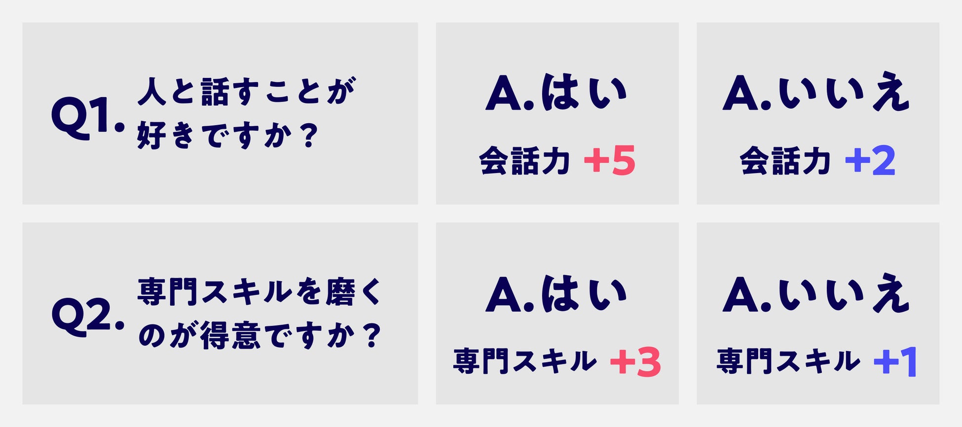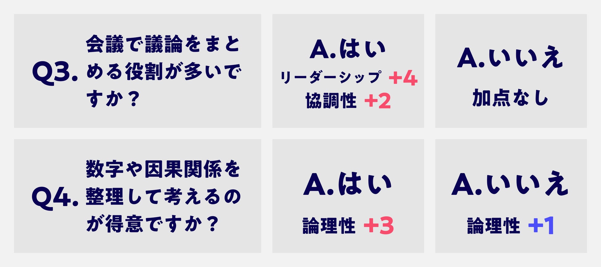例:適職診断で「議論をまとめる役割が多い」と回答すると、「リーダーシップ+4」「協調性+2」を同時に加算。