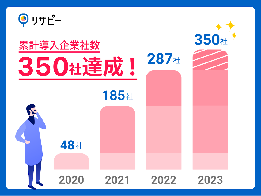 みなさまにご利用いただいて、リサーチデータマーケティング『リサピー®︎』は、導入企業社数が350社を達成いたしました。もともと調査を実施し、その結果を自社のニュースとして発信するサービスとして多くご活用いただいておりましたが、企業様からの課題をヒアリングする中で、コンテンツマーケティングの1つとして調査型のWPを活用したいというお声や、営業資料へ組み込むための説得材料として、また、メールマガジンのコンテンツや、セミナーの登壇テーマとしてなど、『リサピー®︎』のご活用方法は多岐に拡がってまいりました。このように、無限大に広がるリサーチデータの活用アイデアは、多くのクライアント様と共に常にバージョンアップし続けています。今後も導入企業様の課題解決を目指し、企業様の飛躍をサポートするべく歩みを進めてまいります。