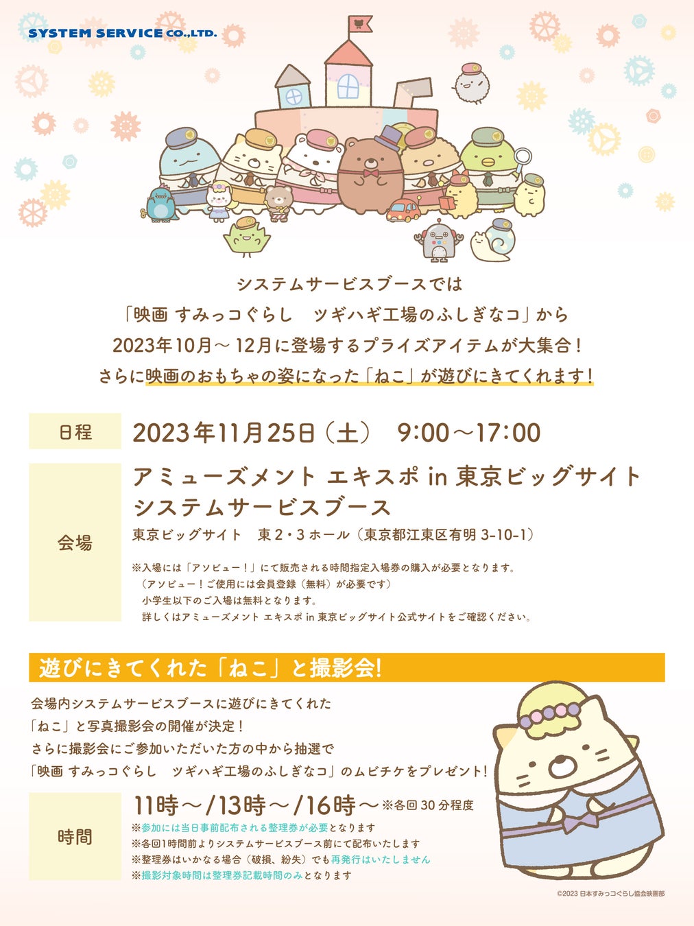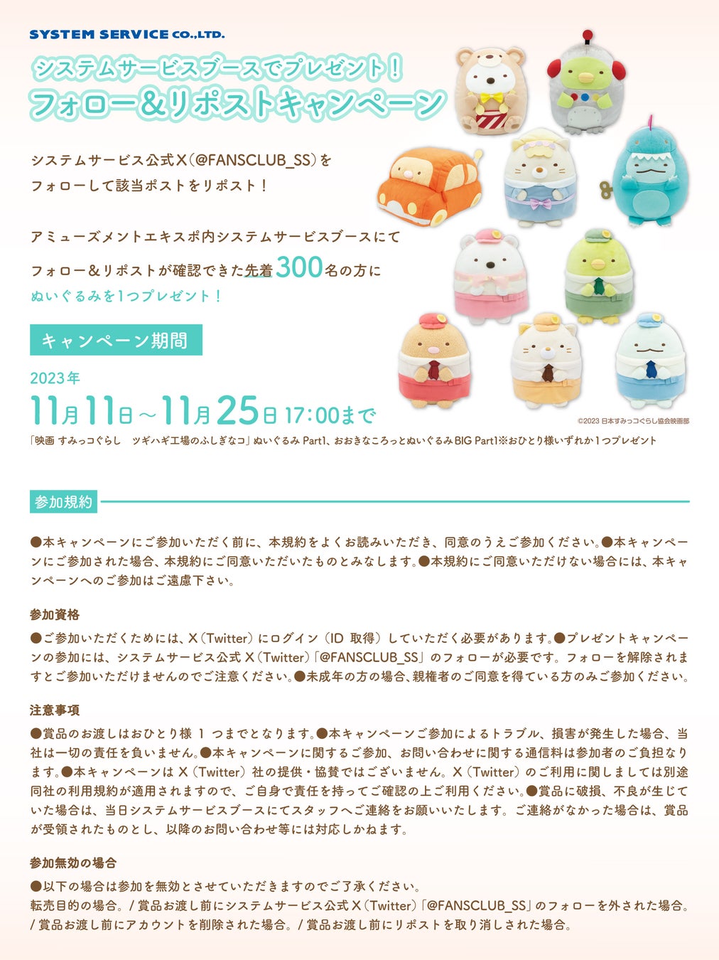 システムサービス公式Xをフォロー、該当ポストをリポストいただき、当日アミューズメントエキスポ内システムサービスブースにてスタッフにお見せいただくと、「映画 すみっコぐらし ツギハギ工場のふしぎなコ」ぬいぐるみ Part1、おおきなころっとぬいぐるみBIG Part1の中からおひとり様いずれか1つプレゼント