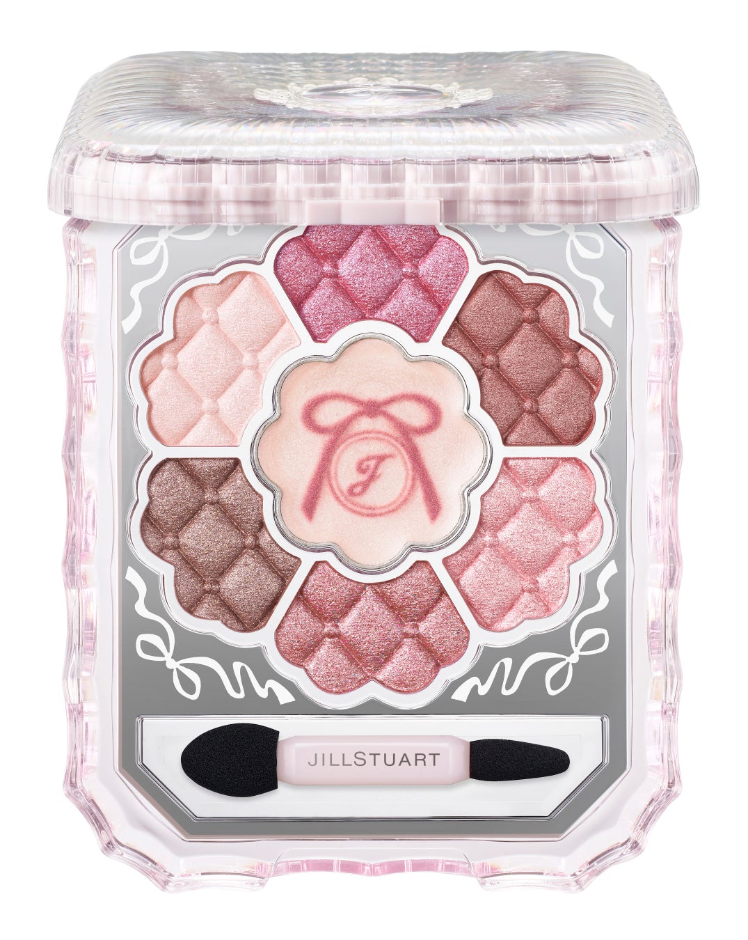 ピンクトーンの様々なリボンをモチーフとした7色のパレット。リボンパターンにチュールを思わせるオーロラカラーを合わせ、ランウェイに登場する華やかなドレスを表現したコンパクトです。アイカラーの表面には、ドレスの質感をイメージしたプレスを刻み、A色には「J」とリボンの限定ステンシルを施しました。
