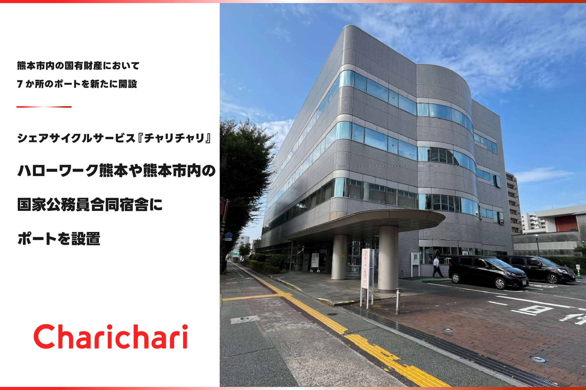 シェアサイクルサービス『チャリチャリ』を運営するチャリチャリ株式会社(本社:福岡市中央区、代表取締役社長:家本 賢太郎、以下「チャリチャリ」)は、ハローワーク熊本(熊本公共職業安定所)および熊本市内の国家公務員合同宿舎の敷地に、計7か所のチャリチャリ駐輪ポートを設置いたしました。