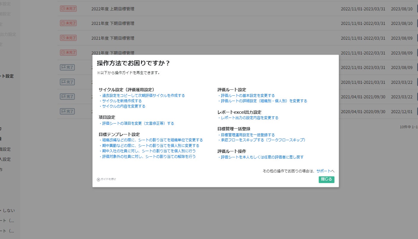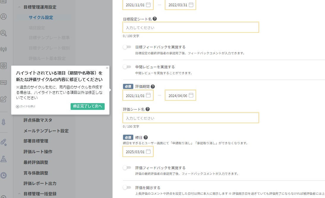 「テックタッチ」により、「CYDAS」の目標管理運用の設定や人事考課の設定など、管理画面の操作に関してこれまでサイダスから導入企業のシステム管理者に口頭で補足していた使い方や、マニュアルに記載されているポイント部分を、全て画面上に表示することが可能になります。この点が、顧客の導入負担軽減や活用促進につながると評価されました。入力時の注意事項等の案内や、該当画面への自動遷移により、システム管理者の利便性向上に繋がると見込まれています。