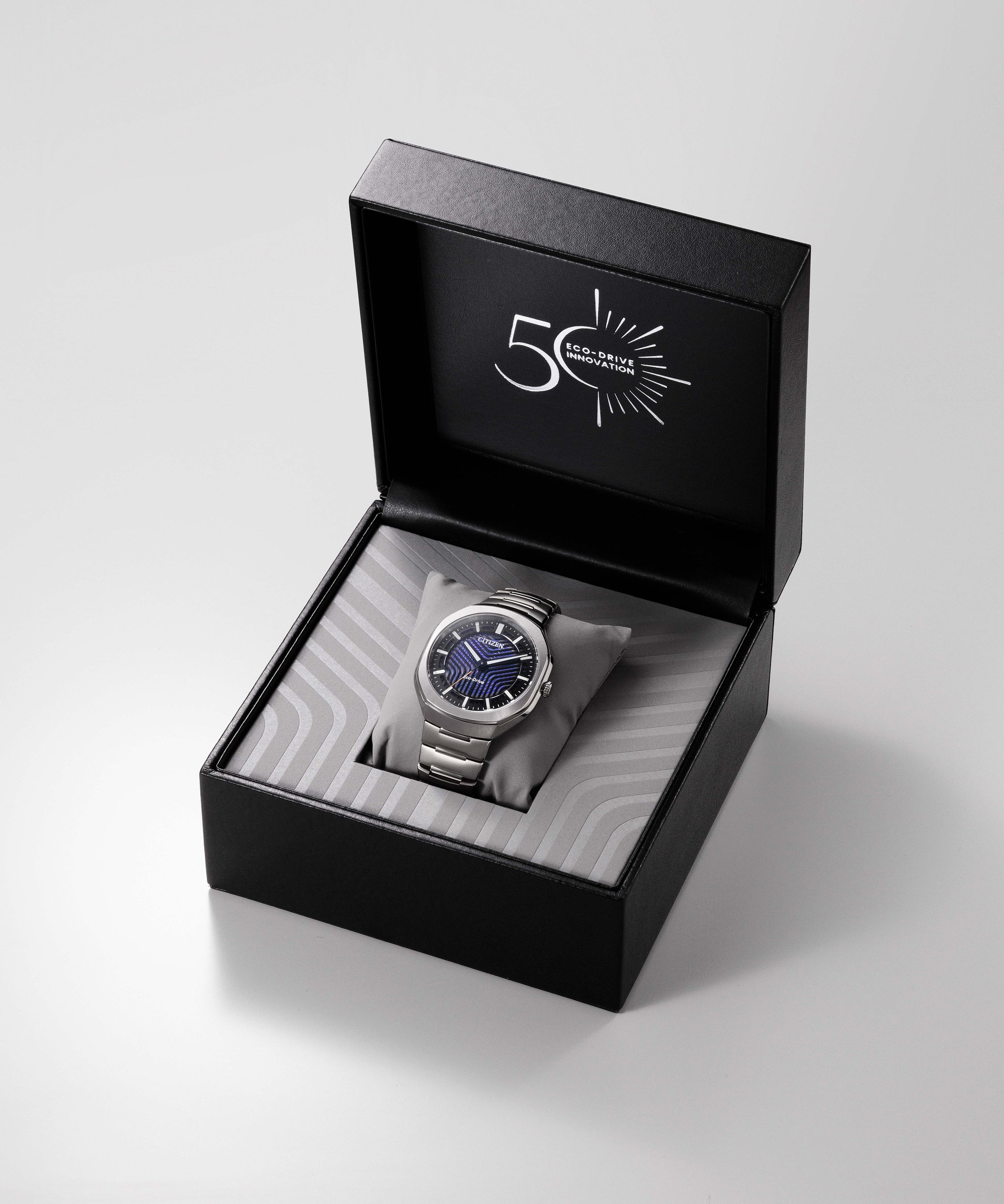 ・裏ぶたには、エコ・ドライブ50周年記念ロゴと、リミテッドエディションナンバーが刻印されています。文字板の印象的なスリットがデザインされた専用BOX付です。