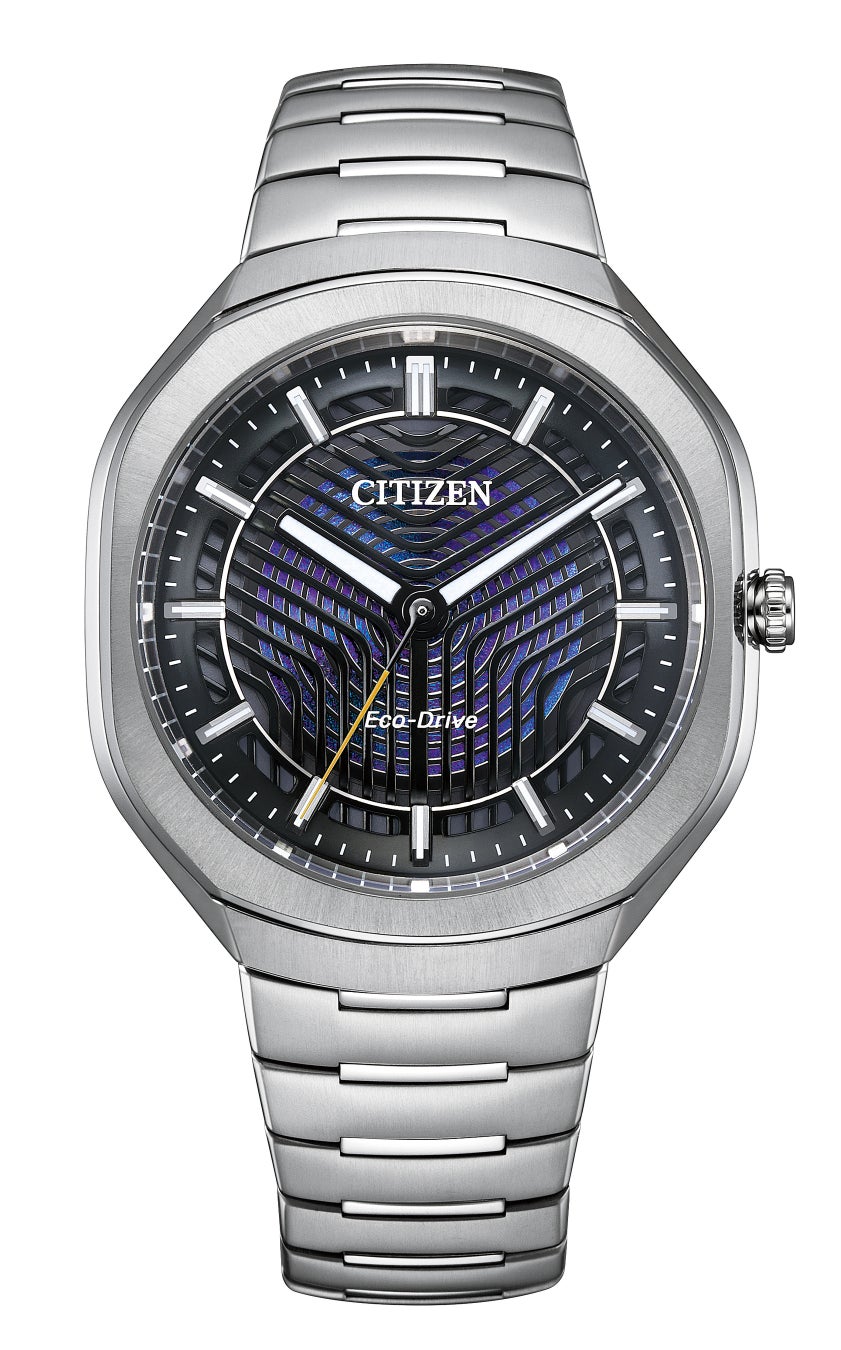 本モデルは、光にまつわる科学の歴史にインスパイアされており、太陽光や室内のわずかな光を電気に換えて時計を動かし続けるシチズン独⾃の技術エコ・ドライブの革新と進化を表現した斬新なデザインが特長です。「PHOTON」とは、光のエネルギーが量子としてやりとりされる際の単位を表します。文字板は、波紋のようなスリットの入った2枚の金属板が重なり、スリットの隙間からは光が反射することで、さまざまな表情や色味になる構造色文字板※3がのぞきます。ムーブメントは、一度フル充電すれば365日動き続ける新型ムーブメントCal.E036を搭載。半世紀にわたり光発電時計を開発し、その中でも新しい表現技法にチャレンジしてきたシチズンだからこその複雑な文字板構造のモデルです。ケースとバンドは軽量で耐傷性に優れたスーパーチタニウムTM※4を採用しています。丸みを帯びた八角形のケースにシームレスなバンドがつながることで、時計全体を包み込む一体感があり、なめらかな形状ながらアイコニックな造形です。