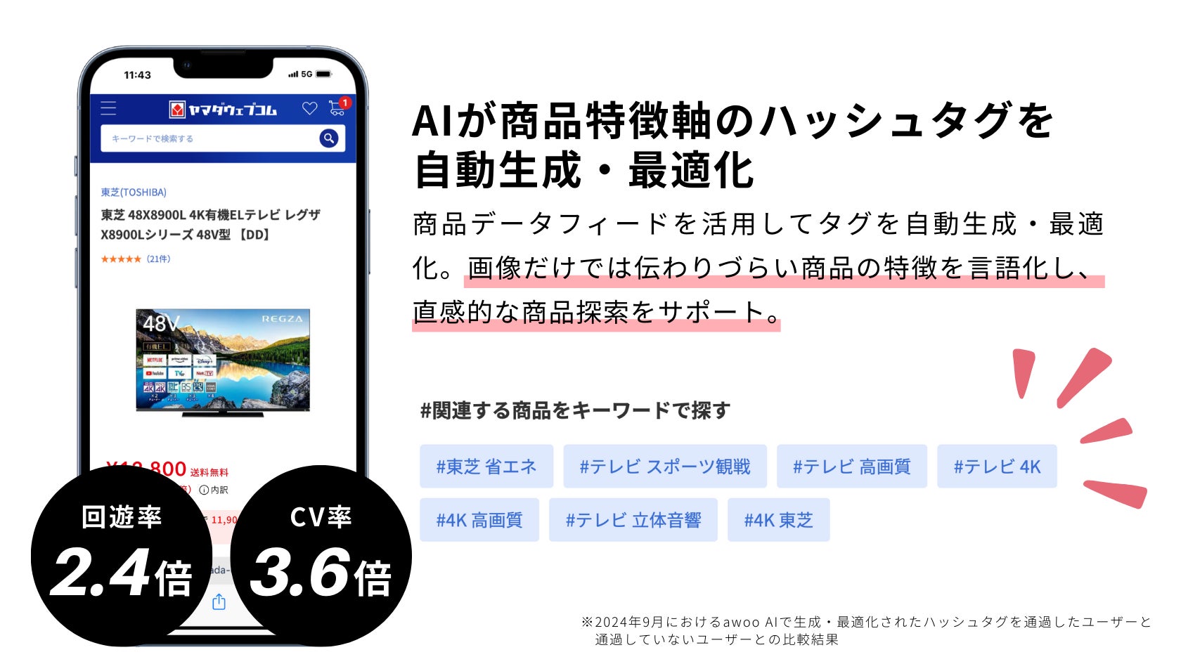 AIサジェストソリューション『awoo AI』を提供するawoo株式会社(本社:東京都渋谷区、Japan Country Manager : 遠藤 光一、以下「awoo」)は、ヤマダデンキの通販サイト「ヤマダウェブコム」におけるAIハッシュタグ・画像レコメンドの活用事例を公開しました。