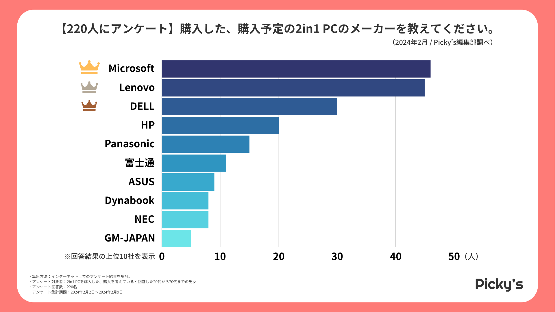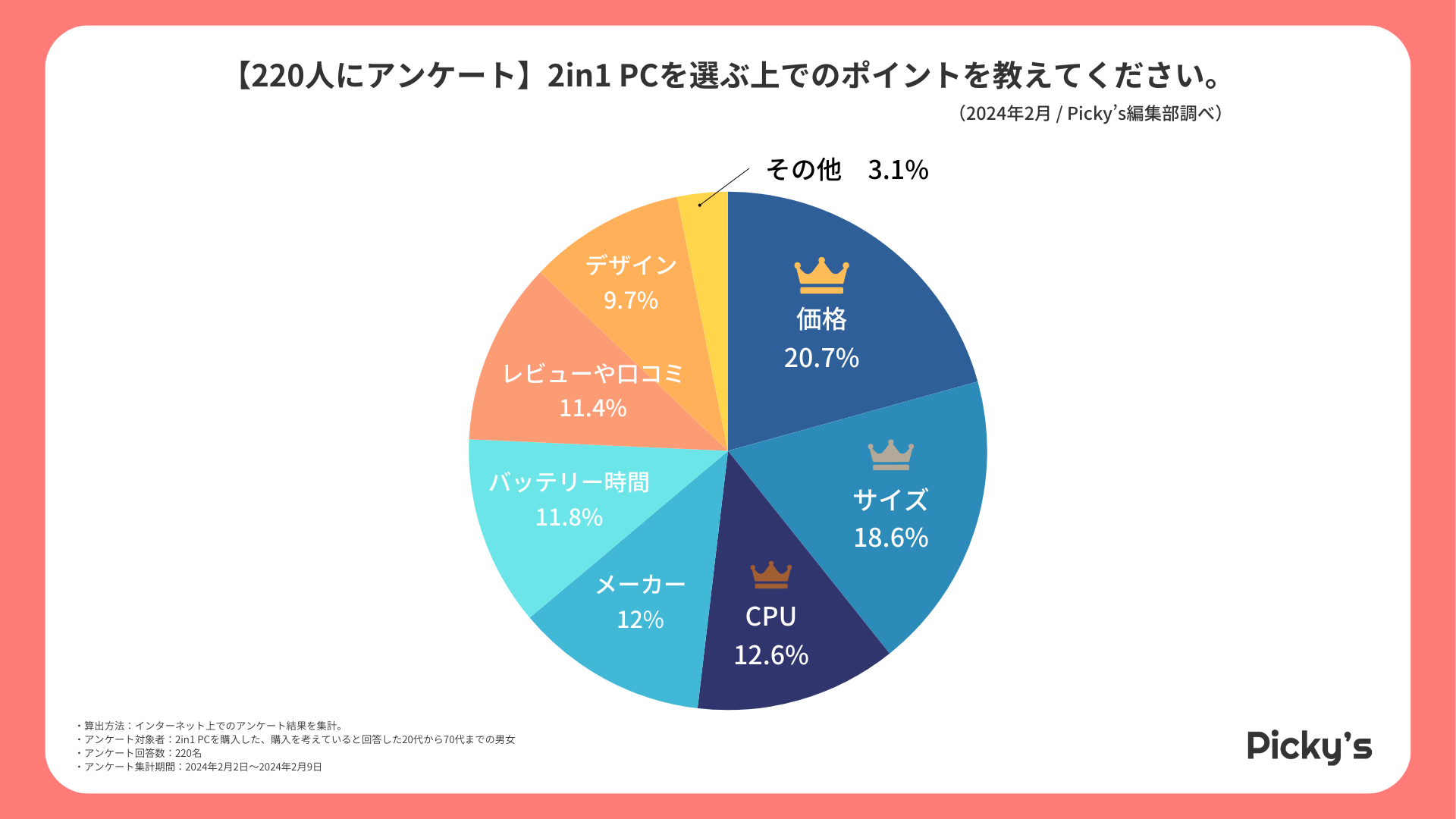 「Picky’s」は、インターネットショッピングにおいて、購入前に試せない・選ぶべきものがわからないという課題の解決を目標に、あらゆる商品のおすすめランキングや検証レビューを紹介するサイトです。このたびPicky’s(https://rentry.jp/)では、2in1 PCについてインターネット上でアンケート調査を行いましたので発表いたします。