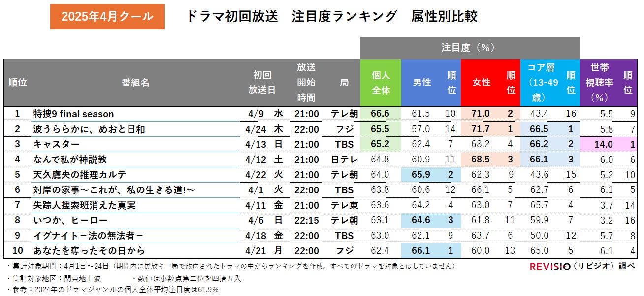 2025年の春ドラマは、テレビ朝日「特捜9 final season」が初回放送注目度1位を獲得。個人全体注目度66.6%という好スタートを切りました。続く2位は注目度65.5%のフジテレビ「波うららかに、めおと日和」、3位は65.2%のTBS「キャスター」でした。