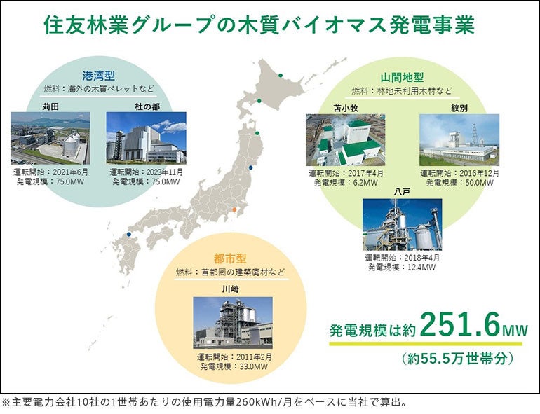 2011年2月に建築廃材等を主燃料とした都市型の川崎バイオマス発電所(33MW)を稼働し再生可能エネルギー事業に参入しました。2023年11月には宮城県仙台市で港湾型の杜の都バイオマス発電所(75MW)の営業運転を開始。2024年12月末現在は国内6か所で事業を展開しています。当社グループの発電規模は合計で約251.6MWで、約555,000世帯分※の年間使用量に相当する電力を供給しています。