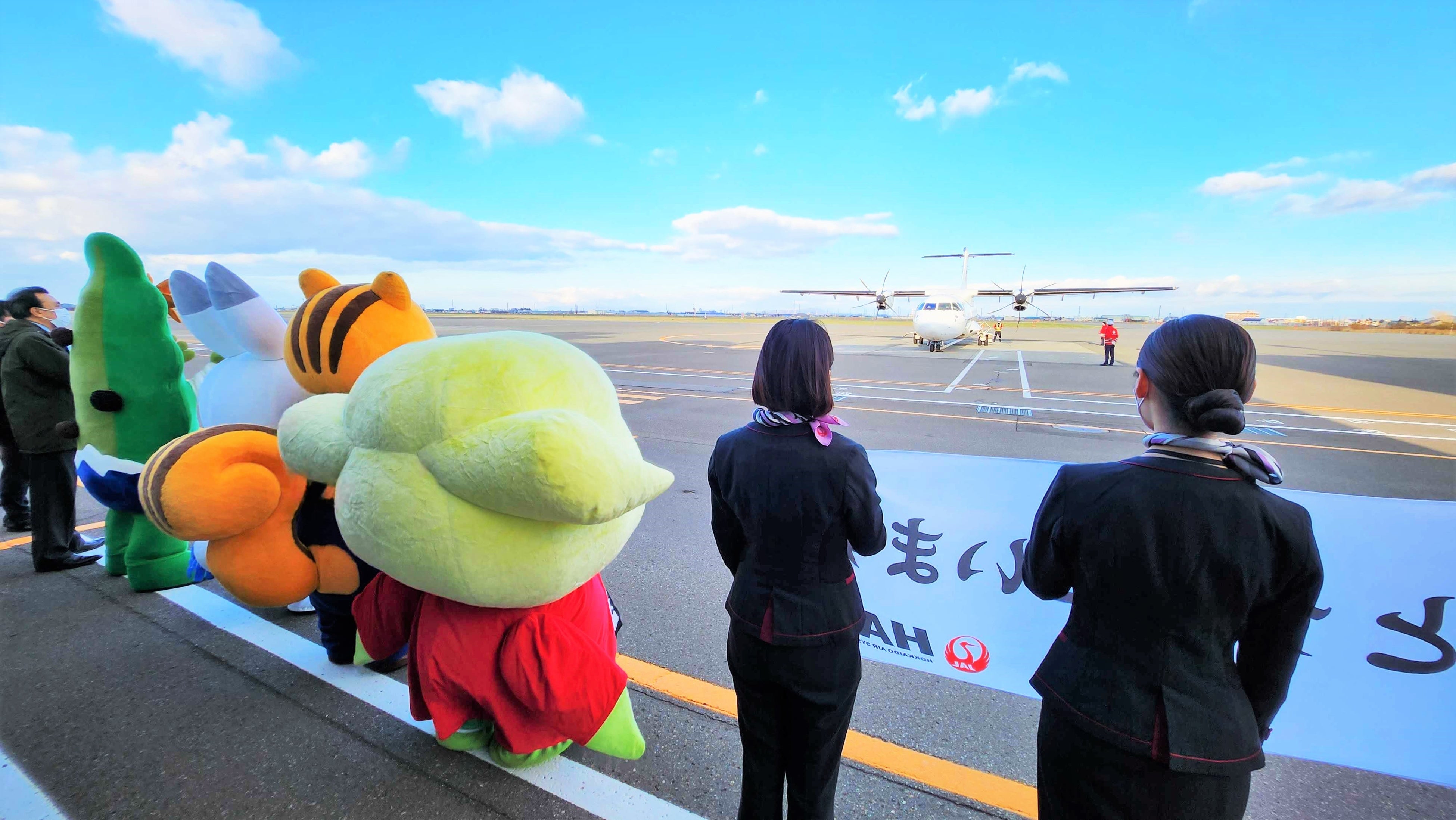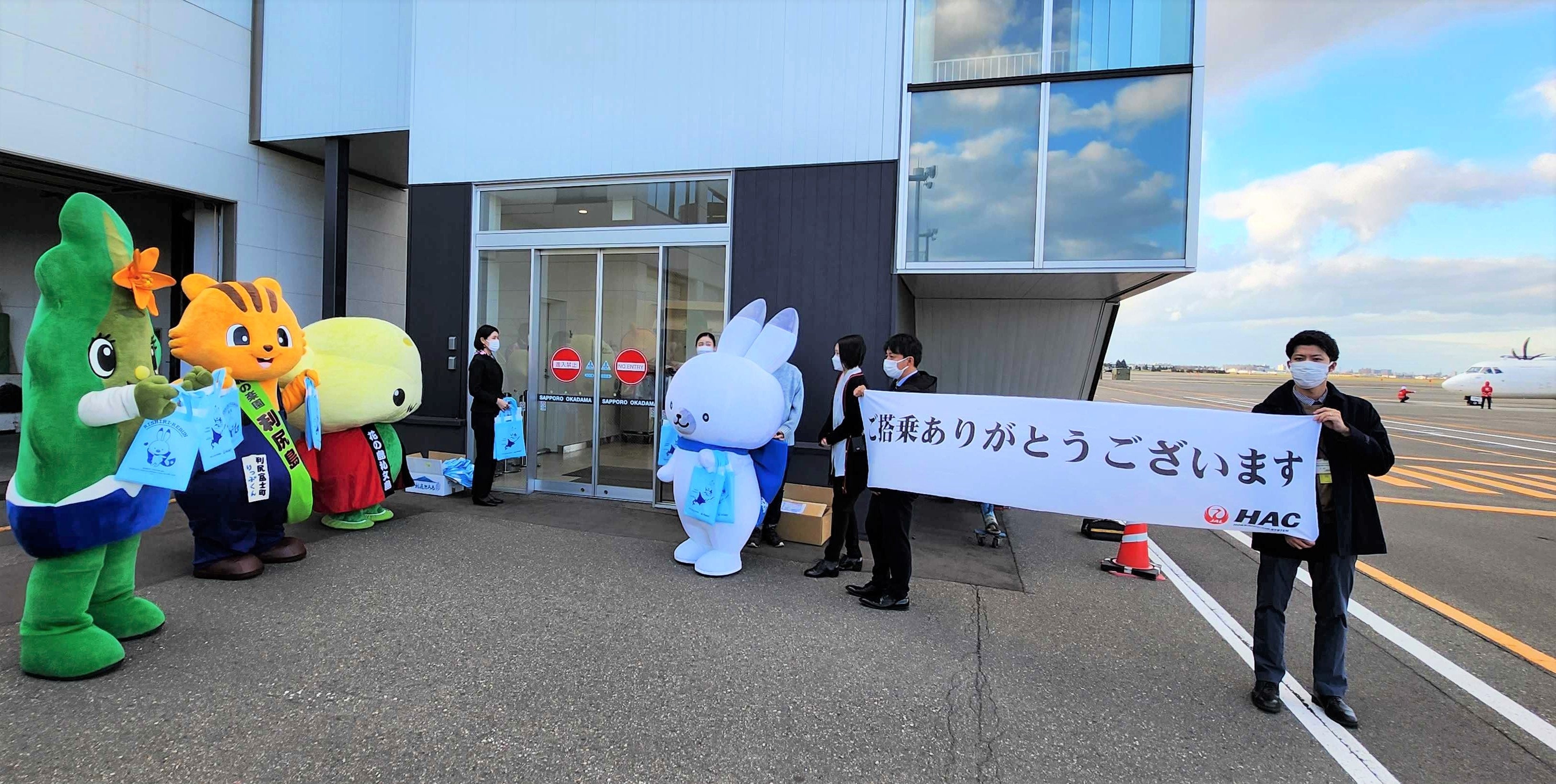 その後、14:20発の札幌(丘珠)-利尻線にご搭乗される皆様を、キャラクターたちが出発口でお出迎えするサプライズを実施。本日のためにご用意した利尻島・礼文島にちなんだ記念品を『ラビット・ユキネ』のオリジナルトートバッグに入れて手渡しし、利尻島へと飛び立つ飛行機を見送りました。