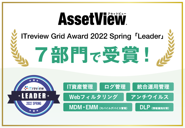 「ITreview Grid Award」とは、「ITreview」で投稿されたレビューをもとに四半期に一度ユーザーに支持された製品を表彰するものです。「AssetView」は7部門【IT資産管理/ログ管理/統合運用管理/Webフィルタリング/アンチウイルス/MDM・EMM(モバイルデバイス管理)・DLP】で「Leader」を受賞いたしました。