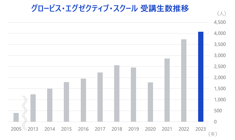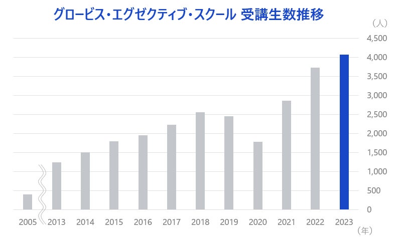 GESは、組織変革を成功に導くことができるトップリーダーの育成を目的とした、企業の中核を担うマネジメント層向けの経営幹部養成プログラムです。2005年の提供開始以来、取引企業数は順調に増加。経営幹部及び経営幹部候補の受講生数は、開始当初の400人程度から、昨年2023年には4,000人を超え、18年で約10倍に拡大しています。
