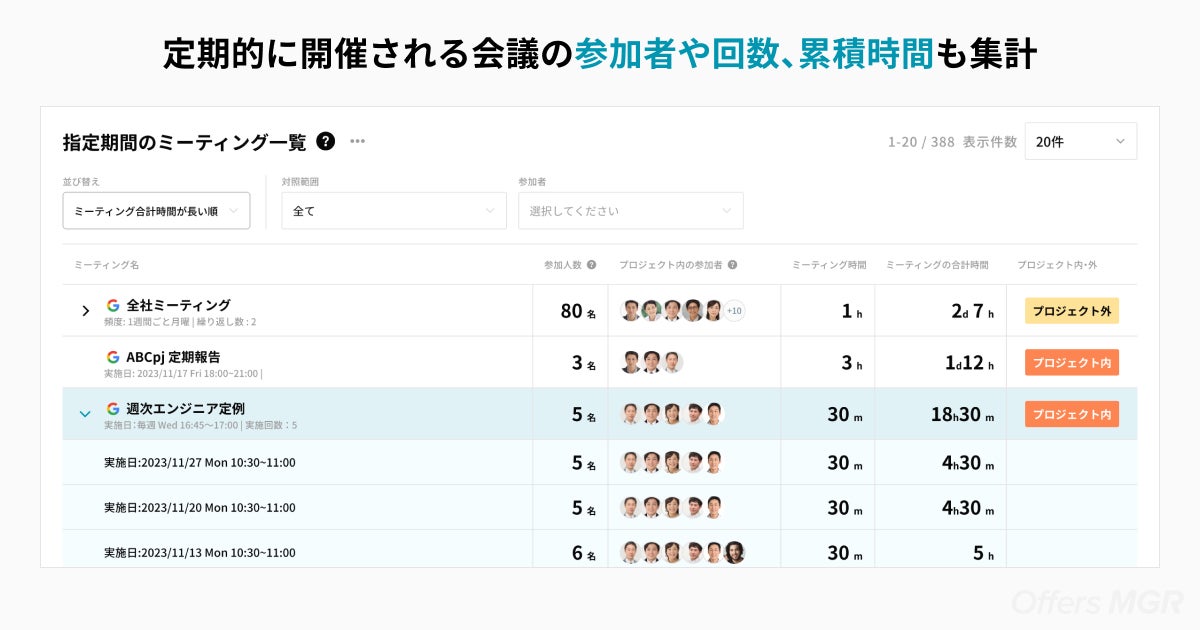 3. 定期的に開催される会議の参加者や回数、累計時間も集計できる