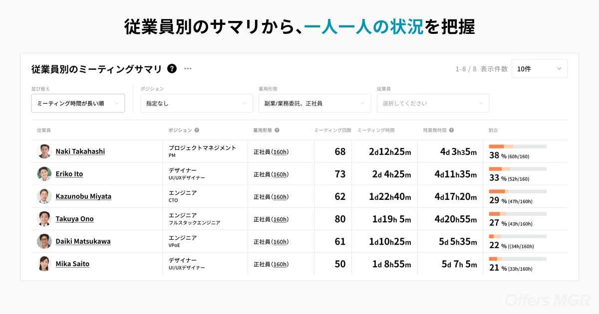 Offers MGRはこれまで、開発組織の生産性向上に向けて、チームや個人の課題を解決するサービスの開発・提供を行ってまいりました。開発生産性を妨げる要因は多岐に渡りますが、その中でも開発者が社内の会議や調整業務に追われ、作業時間が取れず、開発スピードに繋がらないといった課題が多く散見されました。これらの課題は、メンバー一人ひとりのスケジュールや様子までチェックする必要があるため、複数名をマネジメントする立場であるマネージャー視点からは、気が付くのが難しいといった課題もあります。