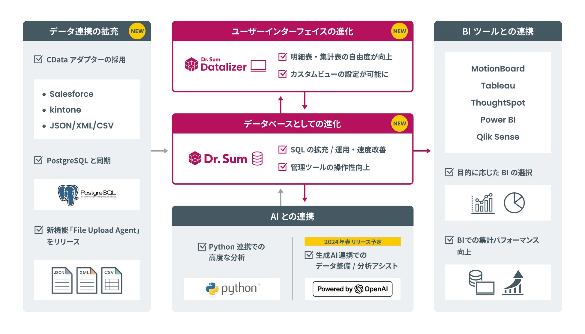 1.データ連携の拡充 | ・新たにCData Software社のアダプターを採用。クラウドアプリとのシームレスなデータ連携も可能になります。 ・データ連携ツール「Dr.Sum DataLoader」の同期機能の対象データベースにPostgreSQLが加わりました。 ・ファイル・フォルダーを監視し、Dr.Sumへのファイルアップロード、取り込みを自動化する新機能「File Upload Agent」をリリース。手元のファイルを統合・集約する仕組みを簡単に構築できます。 |