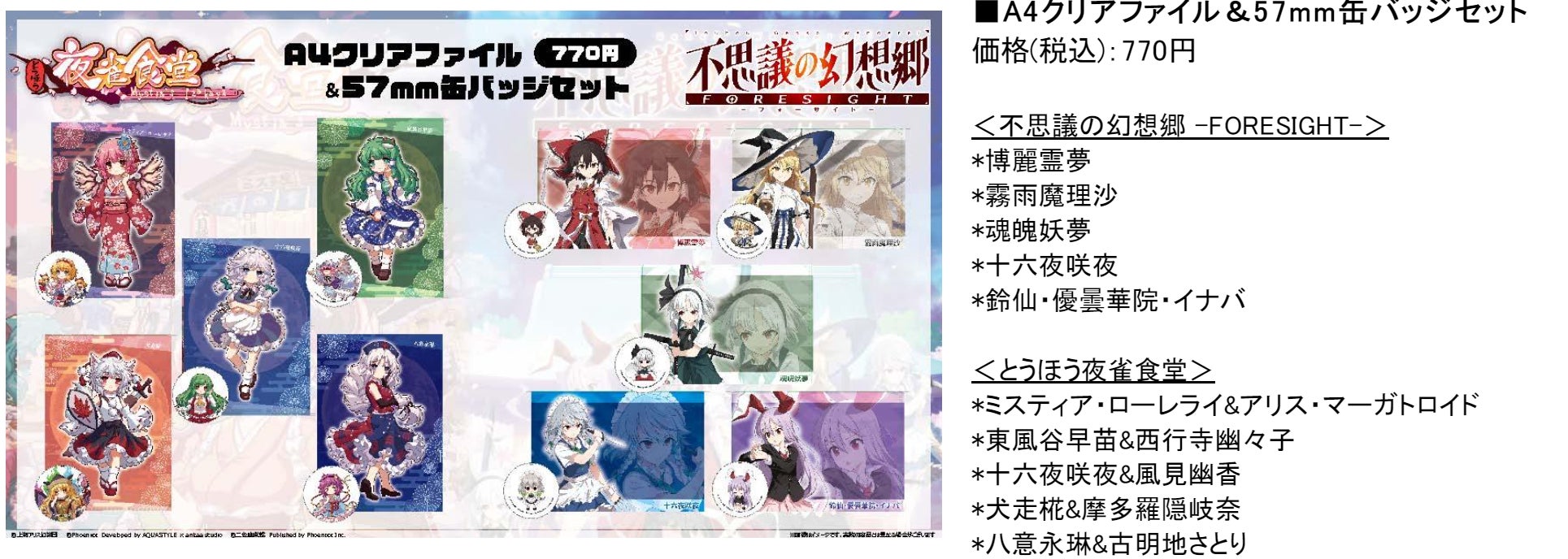 当日Phoenixxブースにお越しいただき、指定のSNSアカウントをフォローいただいた方へ、『とうほう夜雀食堂』のオリジナルクリアファイルをプレゼントいたします。数に限りがございますので、お早めにブースまでお越しください!