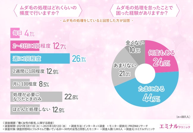 また、「ムダ毛の処理を怠ったことで困った経験がありますか?」と質問したところ、約7割の方が『何度もある(24.0%)』または『たまにある(44.7%)』と回答しました。
