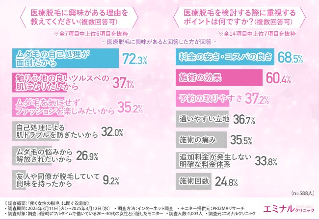さらに、医療脱毛を選ぶ際に重視されるポイントとして、「料金の安さ・コスパの良さ」「施術の効果」「予約の取りやすさ」が上位に挙げられました。働く女性にとって、医療脱毛は長期的な自己処理の負担軽減につながる投資と考えられており、その費用対効果が求められています。加えて、仕事の合間に通いやすいかどうかも重要な要素となり、「予約の取りやすさ」がクリニック選びの決め手の一つになっていることがわかります。