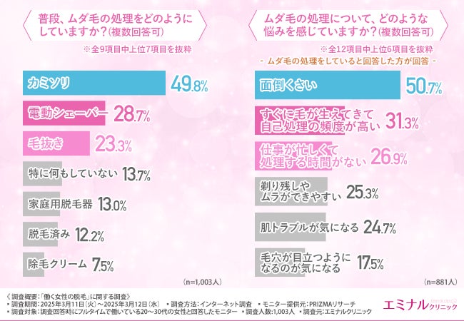 一方で、「面倒くさい」「すぐに毛が生えてくる」「仕事が忙しくて処理する時間がない」といった悩みを抱える人も多く、特にフルタイムで働く女性にとっては自己処理の負担が大きいことがわかりました。