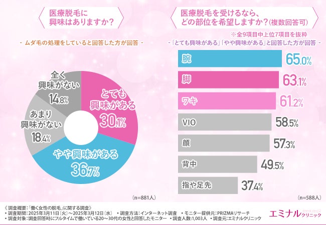 続いて、前述の質問に『とても興味がある』『やや興味がある』と回答した方に「医療脱毛を受けるなら、どの部位を希望しますか?(複数回答可)」と質問したところ、『腕(65.0%)』と回答した方が最も多く、『脚(63.1%)』『ワキ(61.2%)』と続きました。