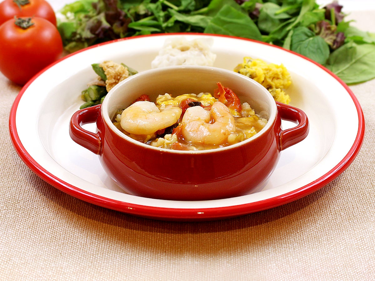 鶏だしで炊いたレジラ米と、醤油味の鶏ガラスープで仕上げた中華リゾットです。プリッとした海老と炒り卵、細かく刻んだ小松菜とドライトマトを彩りよく盛り込みましたので、よく混ぜてお召し上がりください。副菜は干し肉の塩気がやみつきになる、アスパラと干し肉のあえもの、ごろっとした海老が入っているえび焼売、とろっとした卵と細切りチキンを高菜で味付けた、チキンと高菜の卵とじです。