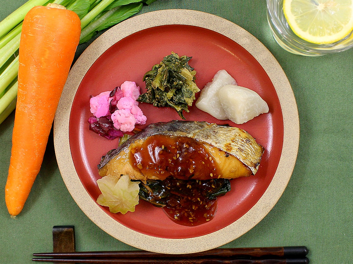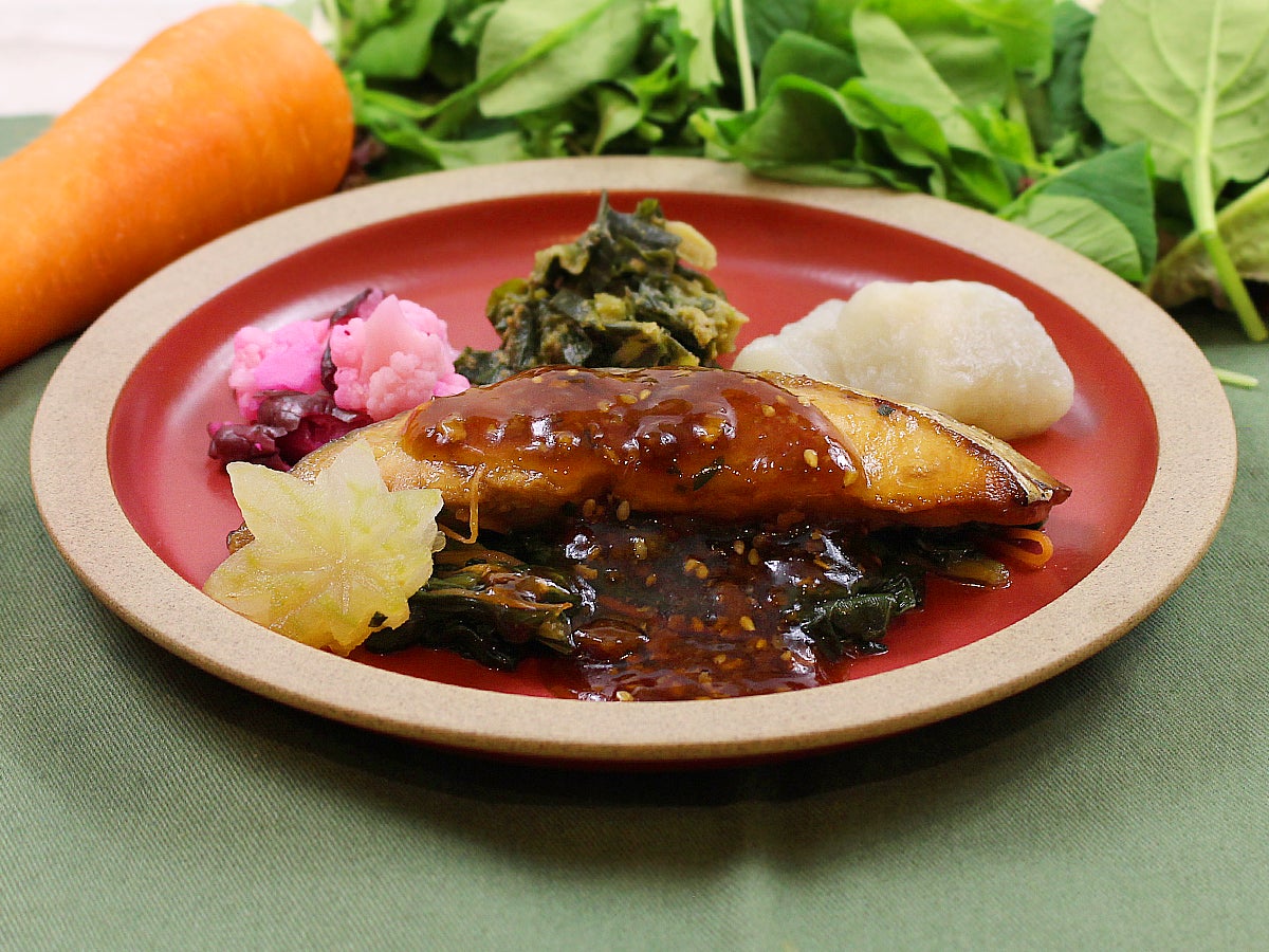 鰆の照り焼きをふっくらジューシーに焼き上げました。本醸造しょうゆを使い味わい深い美味しさに仕上げております。添え野菜の小松菜と人参、紅葉型の冬瓜を甘辛い醤油ダレと絡めてお召し上がりください。副菜は、色鮮やかな漬物と合わせた彩りカリフラワー、菜の花の胡麻あえ、かぶのおひたしです。
