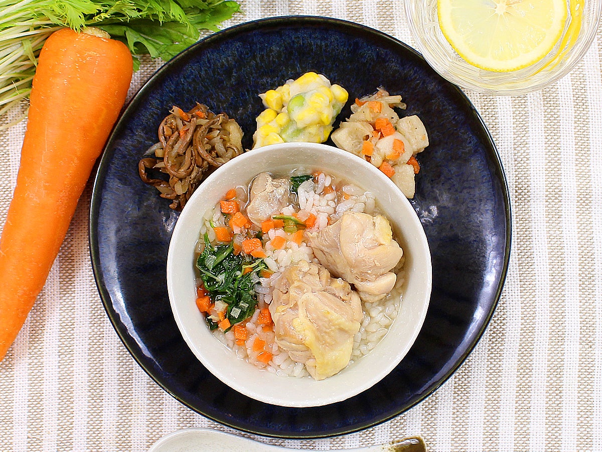 かつおだしが香る優しい味わいの雑炊プレートです。具材にはごろっとした鶏もも肉、香りのよい水菜、細かく刻んだ大根と人参を使用しております。マンナンライスをブレンドしたお米とよく混ぜてお召し上がりください。
