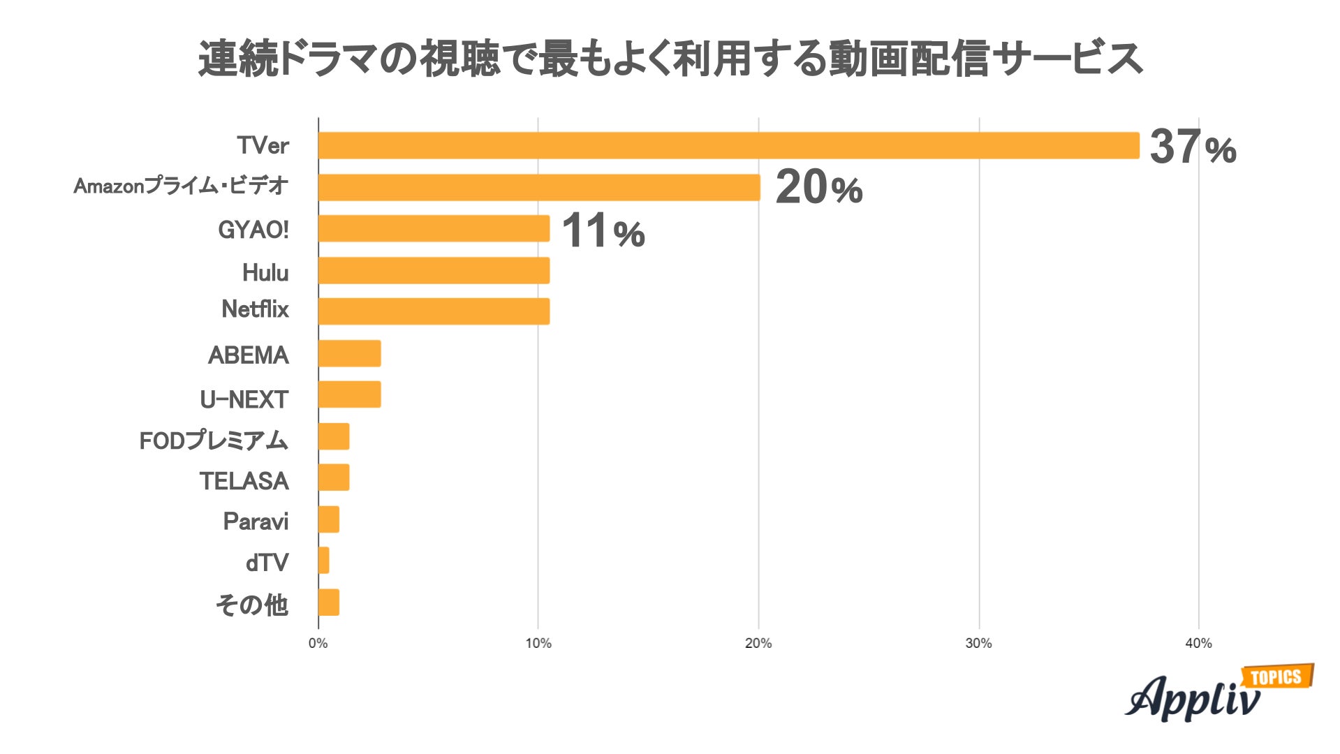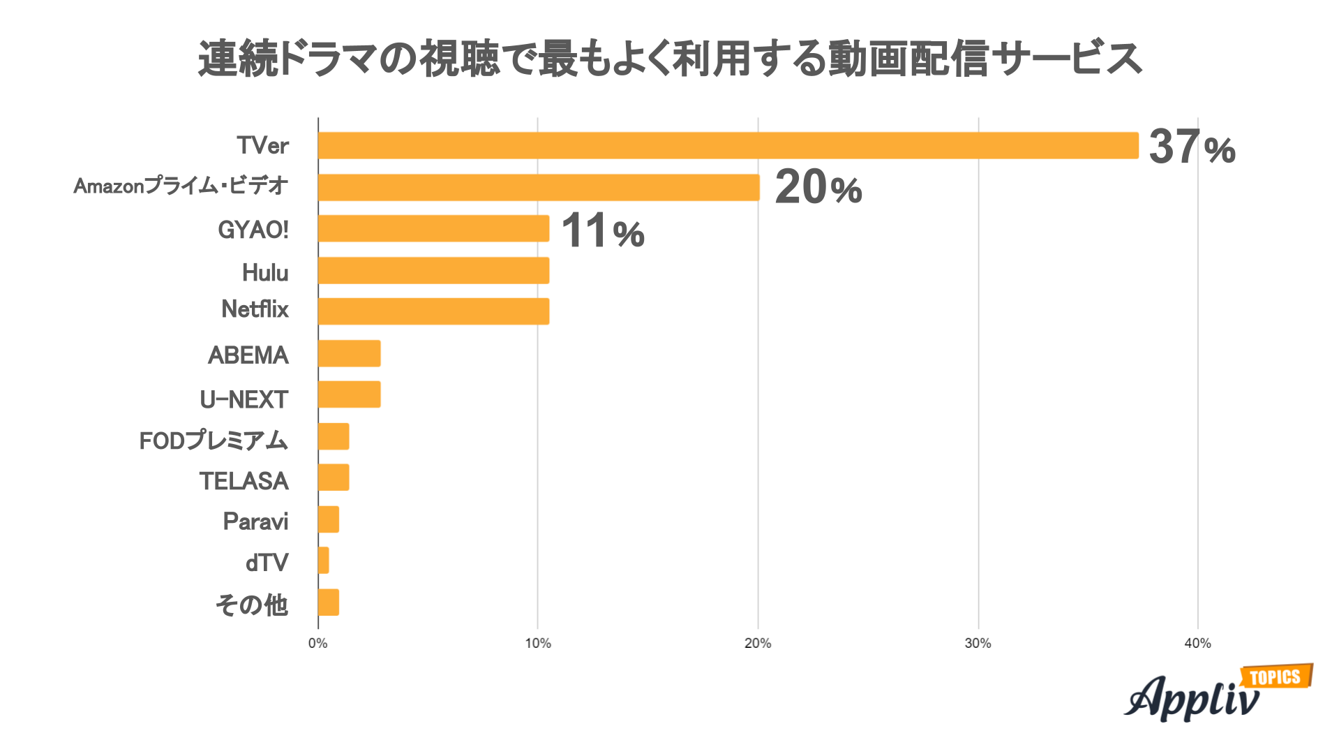 2位は「Amazonプライム・ビデオ」20%、3位は「GYAO!」「Hulu」「Netflix」11%でした。