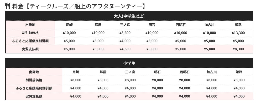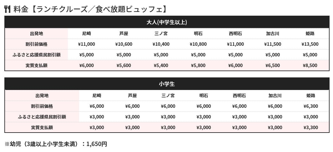 【8月31日迄延長!兵庫県・滋賀県・京都府・和歌山県・奈良県・鳥取県・岡山県・徳島県・香川県民限定!】5,000円から往復JRで行く「コンチェルト」アフタヌーンティーorブッフェ日帰りクルージング