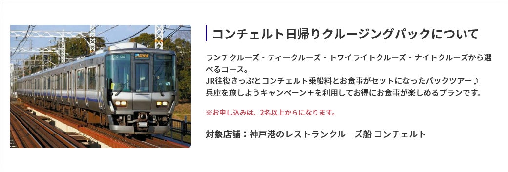 株式会社フォーティーズ(本社:大阪市鶴見区、代表取締役 岡武史)は8月31日迄延長になった「ふるさと応援!ひょうごを旅しようキャンペーン」の対象商品としてランチクルーズ・ティークルーズ・トワイライトクルーズ・ナイトクルーズから選べるコース。JR往復きっぷとコンチェルト乗船料とお食事がセットになったパックツアーのオンライン販売を開始しました。
