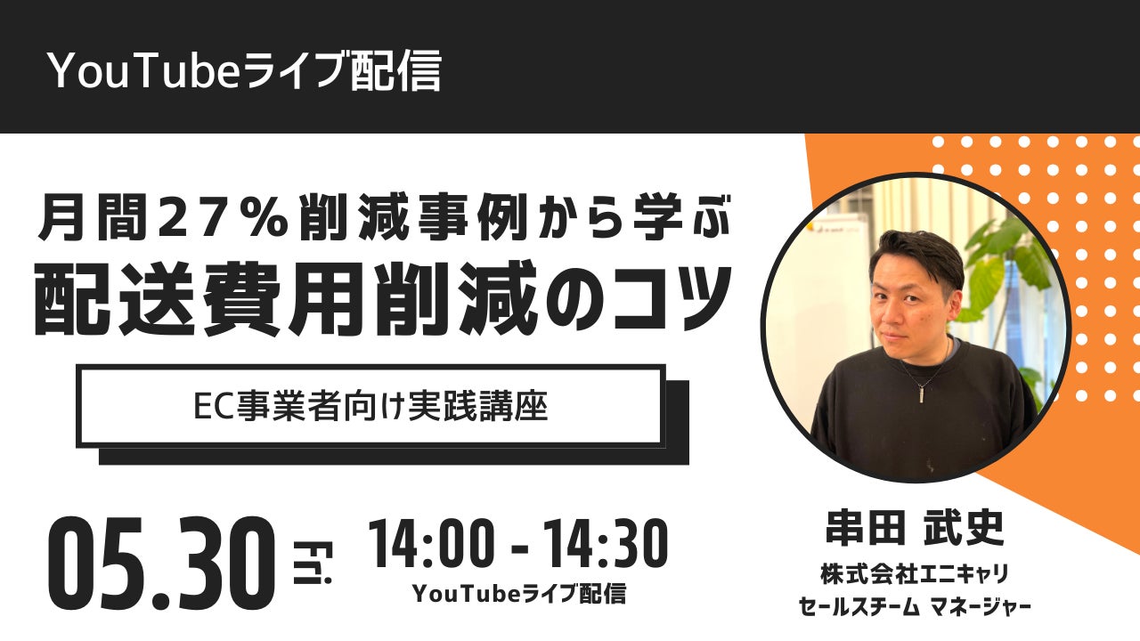 ラストマイル物流に特化した物流ソリューション事業を展開する株式会社エニキャリ(以下エニキャリ)は、「月間27%削減事例に学ぶ、配送費用削減のコツ」と題して5月30日(金)14時より、YouTubeでライブ配信を行うことをお知らせします。
