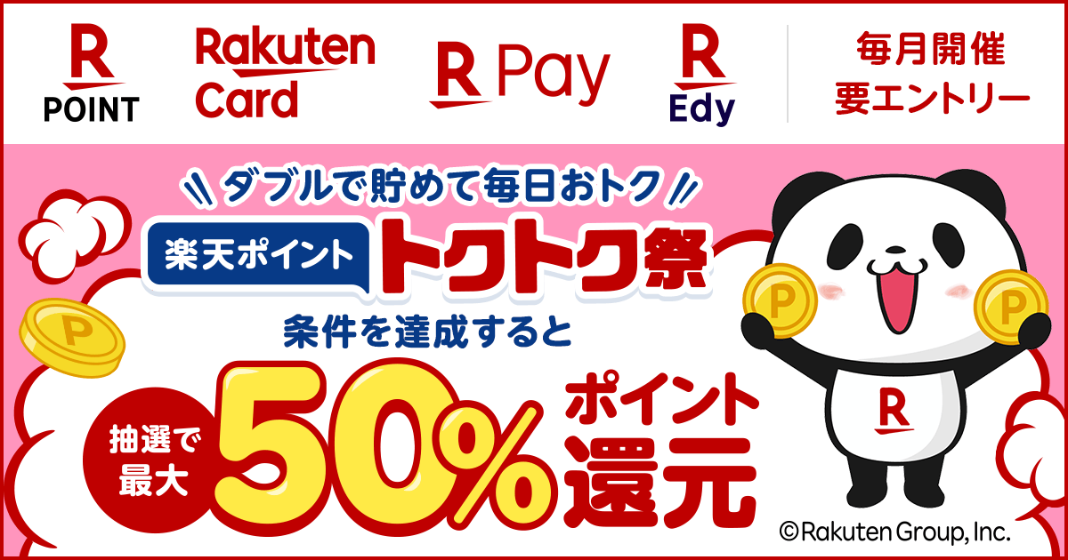 キャンペーン内容:エントリー期間中に本キャンペーンにエントリーのうえ、キャンペーン期間中に「楽天ポイントカード」を提示して、楽天のお支払いサービス(「楽天ペイ」アプリ・「楽天Edy」・「楽天カード」)のいずれか1つ以上で支払いをされた方の中から抽選で100名様に、期間中の楽天ポイントカードを提示した会計金額合計の最大50%分(上限10,000ポイント)を楽天ポイントで進呈します。