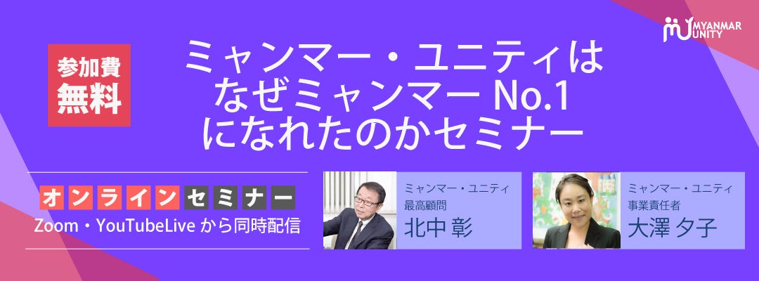 今回は、こうした事情により優秀な人材が豊富に集まるミャンマーにおいて、ミャンマー政府認定No.1人材送り出し機関「ミャンマー・ユニティ」がどのようにして送り出し機関No.1として労働大臣から表彰されるに至ったのか。なぜ、ミャンマー・ユニティに日本で働きたいミャンマー人が殺到しているのかについて、深く掘り下げてお話をする「ミャンマー・ユニティはなぜミャンマーNo.1になれたのかセミナー」を4月20日にオンラインで無料にて開催いたします。