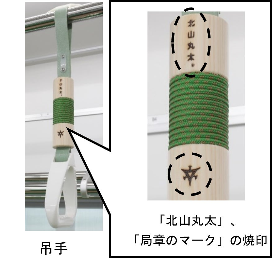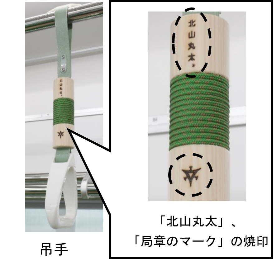 吊手の鞘(さや)を「北山丸太」で製作し、鞘(さや)に「京くみひも」を巻き付け、「北山丸太」と「局章」の焼印を入れました。