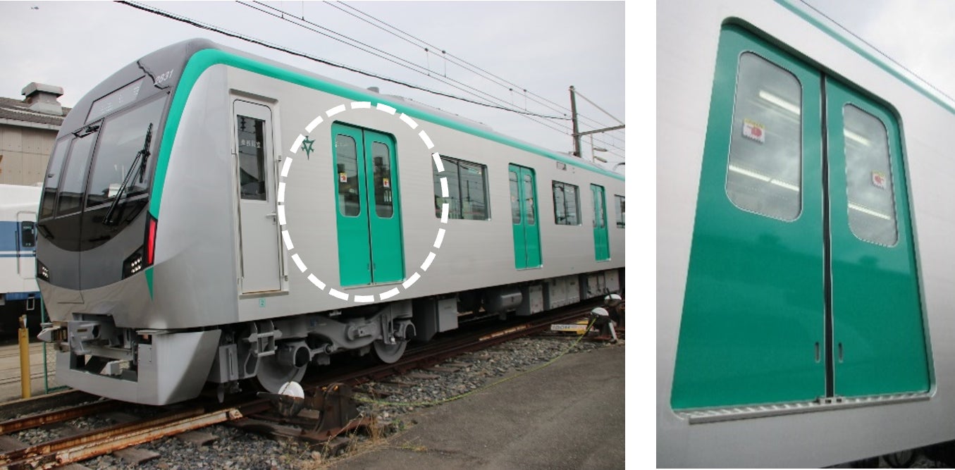視覚に障害がある方の御意見を踏まえ、乗降口ドア外側全体をエメラルドグリーン色にすることで、無塗装の車体側面とのコントラストが生まれ、弱視の方にも 乗降口が分かりやすくなるように工夫しました。
