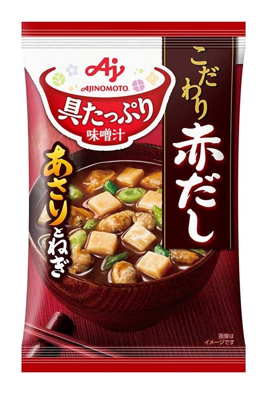 こだわりのかつおだしの豊かな風味と、あさり・ねぎ・豆腐の3つのフリーズドライ具材がたっぷり楽しめる、うま味のきいたまろやかな味わいの赤だしのお味噌汁です。