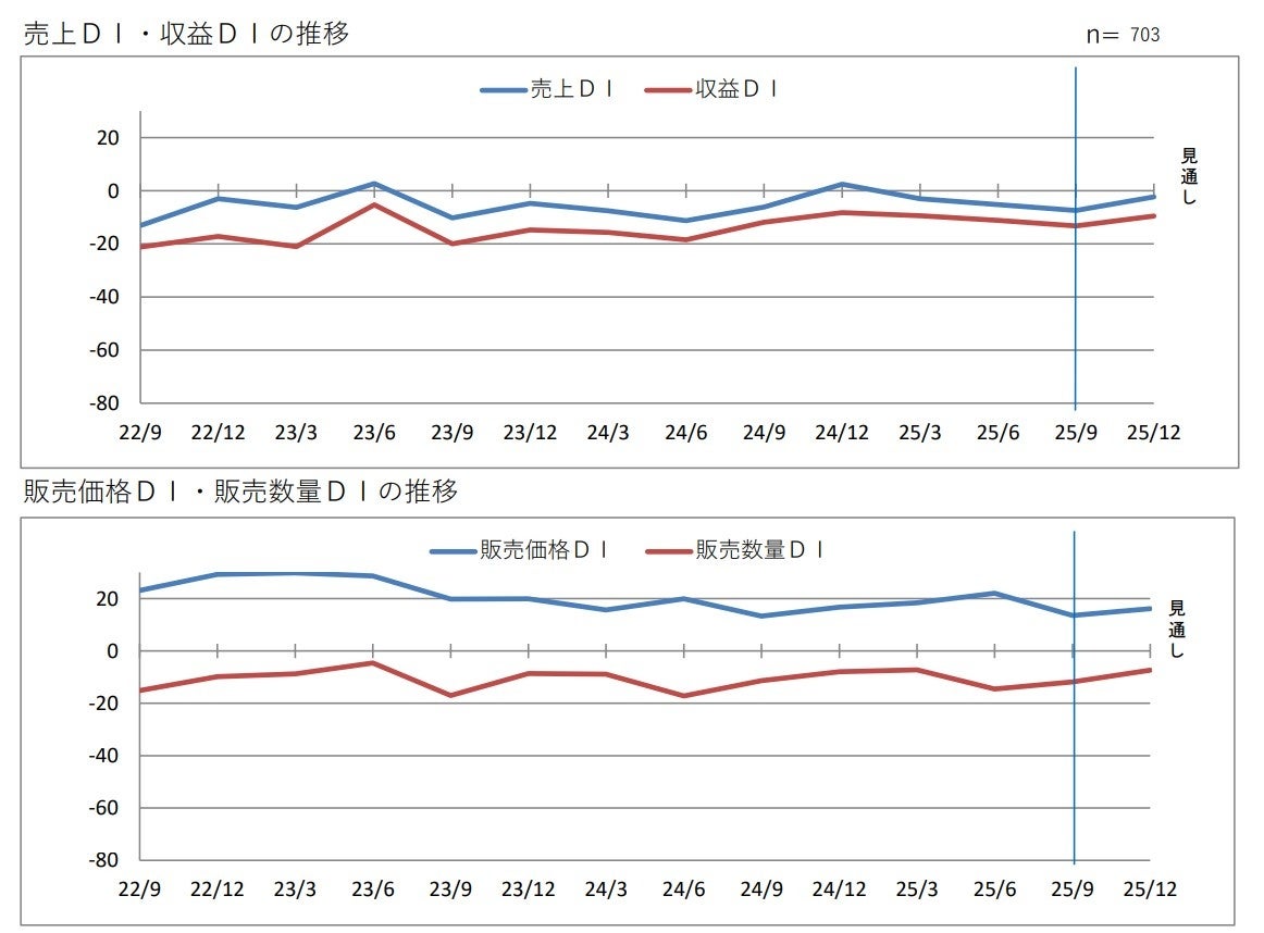 2025年10-12月期は、売上DIが5.1ポイント、収益DIが3.7ポイント上昇し、販売価格DIは2.6ポイント、販売数量DIは4.5ポイント上昇すると予想し、年末商戦への期待が伺えます。