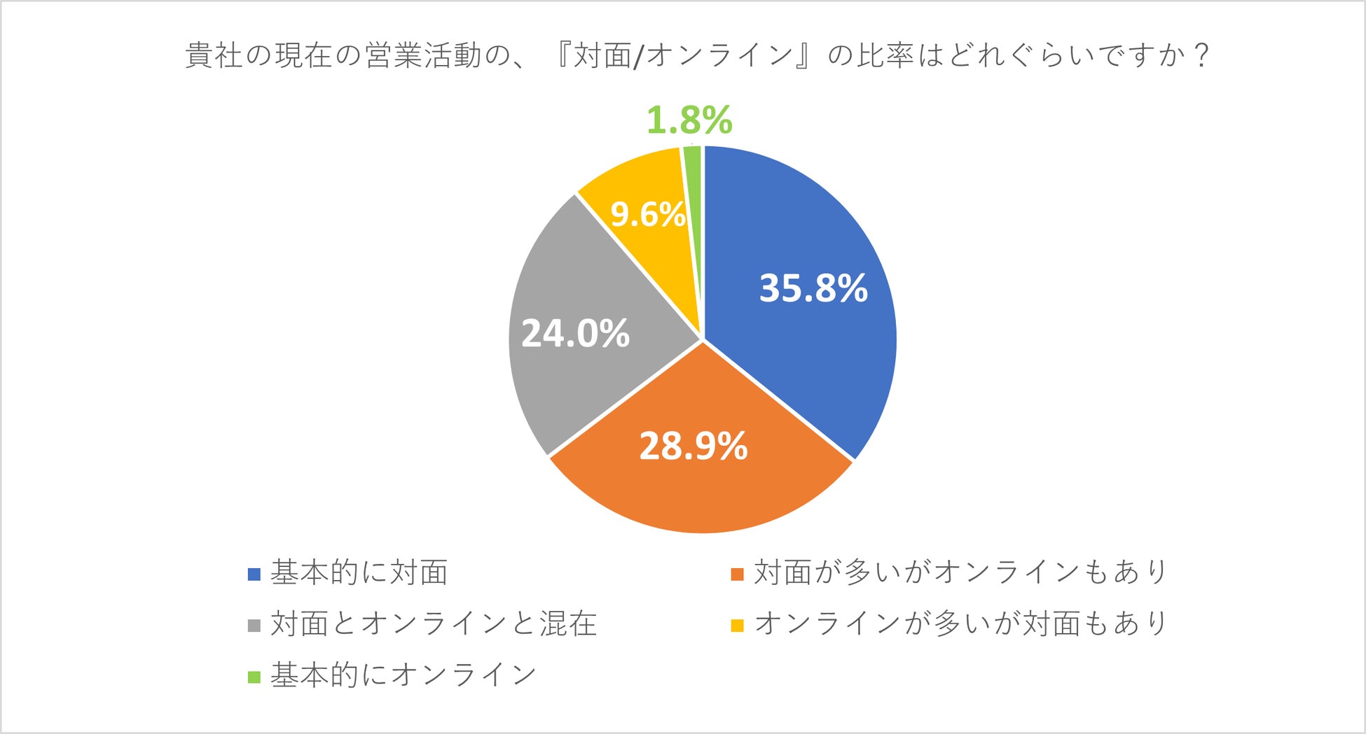「貴社の現在の営業活動の、『対面/オンライン』の比率」について質問したところ、「基本的に対面」が35.8%と最多となった一方で、「対面が多いがオンラインもあり」、「対面とオンラインと混在」、「オンラインが多いが対面もあり」など“対面とオンラインの併用”と回答した割合は、合計62.5%となりました。