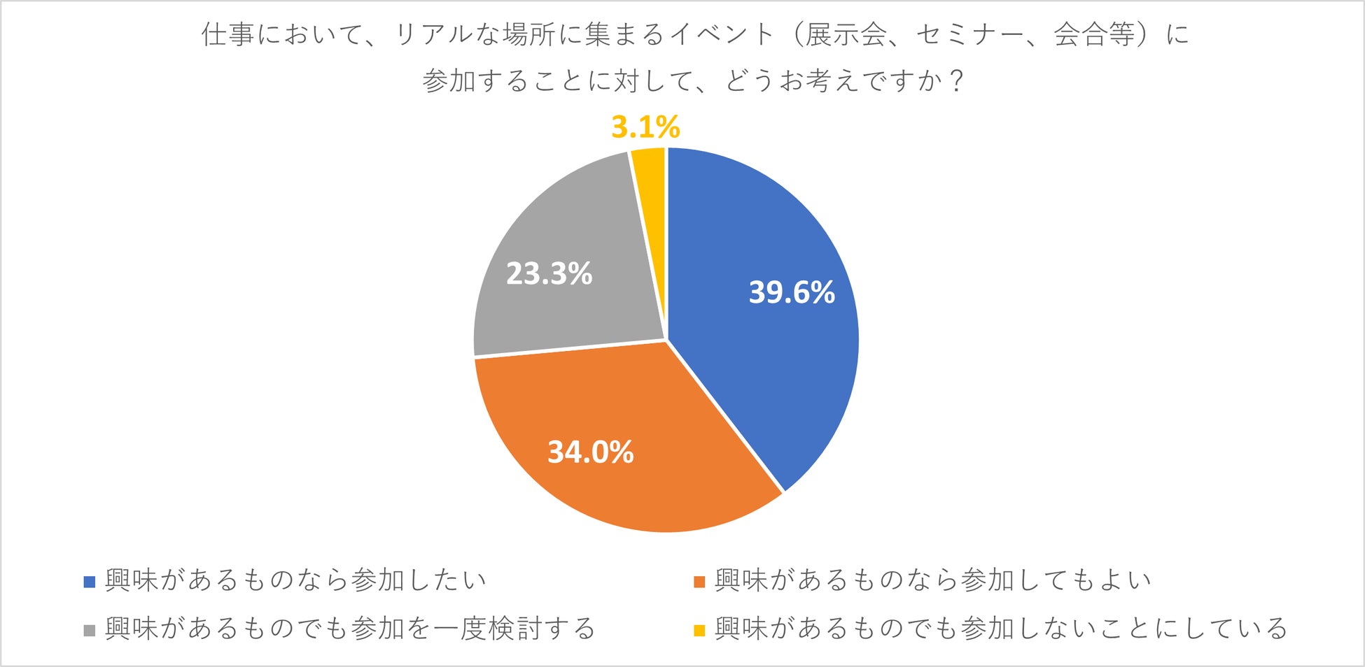 「仕事において、リアルな場所に集まるイベント(展示会、セミナー、会合等)に参加することについて、どう考えるか」について質問したところ、「興味があるものなら参加したい」が39.6%、次いで「興味があるものなら参加してもよい」が34.0%となり、参加に対し前向きな回答が7割を超える結果になりました。