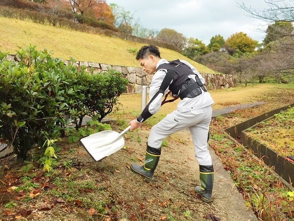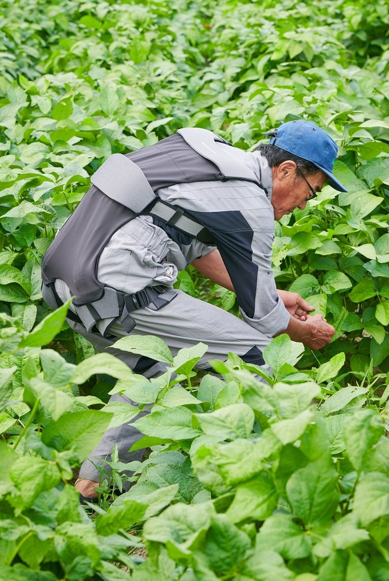 中腰姿勢の負担を軽減する、柔軟・軽量なサポートギアです。腰への不安が多い工場や物流、農業、建築、介護従事者の負担を軽減する目的で開発されました。