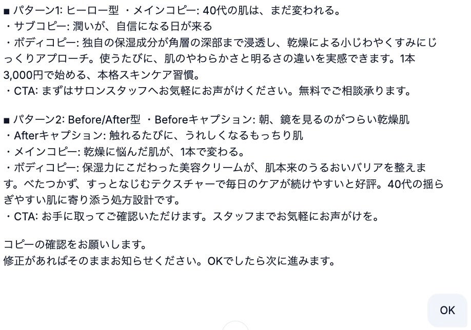 ・ラフ作成:ブランド理解済みAIとの対話で、最適な訴求軸とコピーを生成