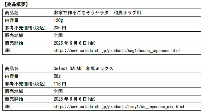 株式会社サラダクラブ(代表取締役社長:新谷昭人、本社:東京都調布市)は、お家でトッピングを加えるだけで、簡単にごちそうサラダが楽しめる「お家で作るごちそうサラダ 和風サラダ用」(120g/税込235円)と1人前の食べ切りサイズ「Select SALAD 和風ミックス」(58g/税込116円)」の2商品をリニューアルし、2025年6月6日(金)から全国(一部地域を除く)で発売します。
