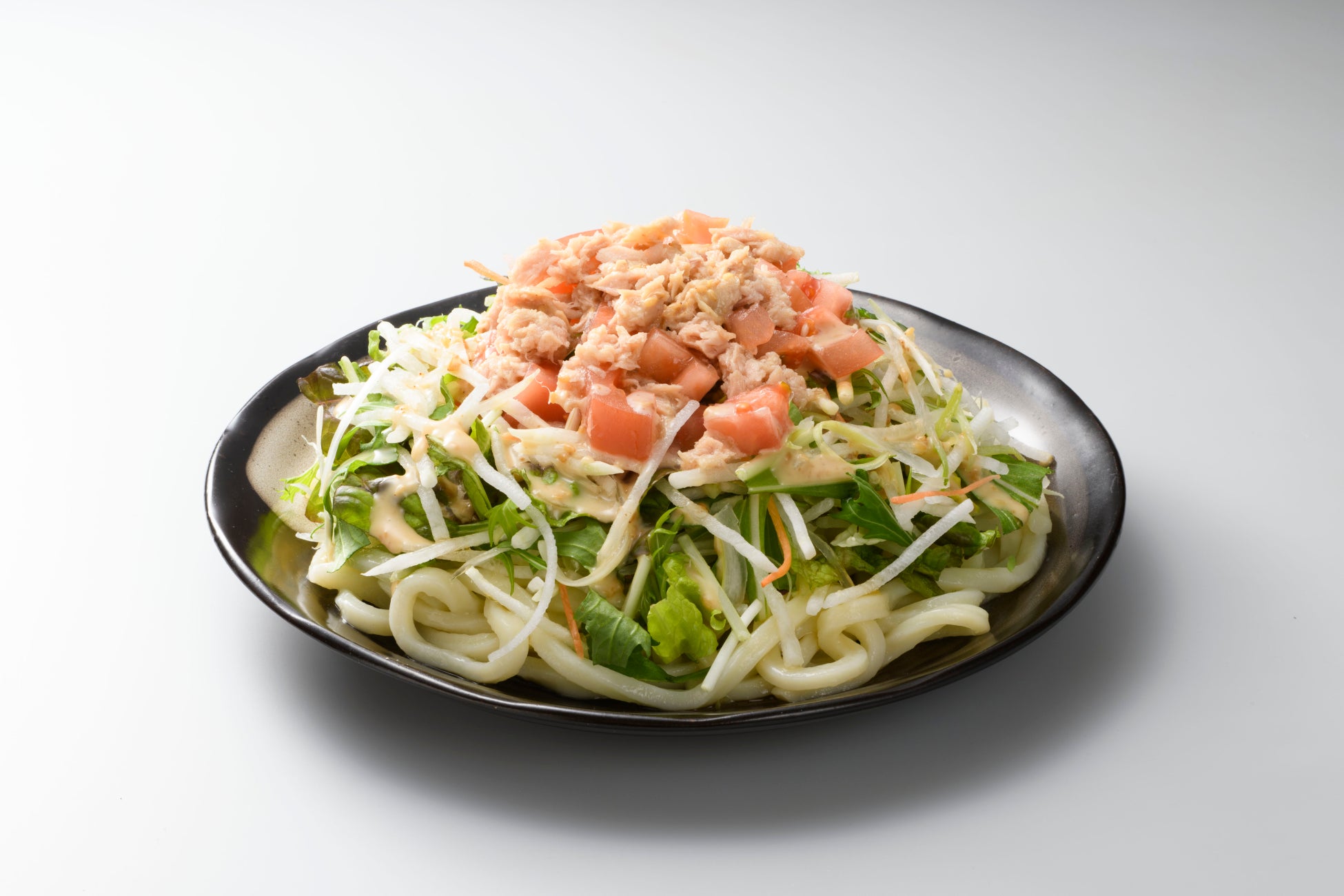 ③お皿に、①を盛りつけ、めんつゆを注ぎ、「お家で作るごちそうサラダ 和風サラダ用」「キユーピーサラダクラブライトツナ(フレーク)」②をのせ、「キユーピー深煎りごまドレッシング」をかけて完成!