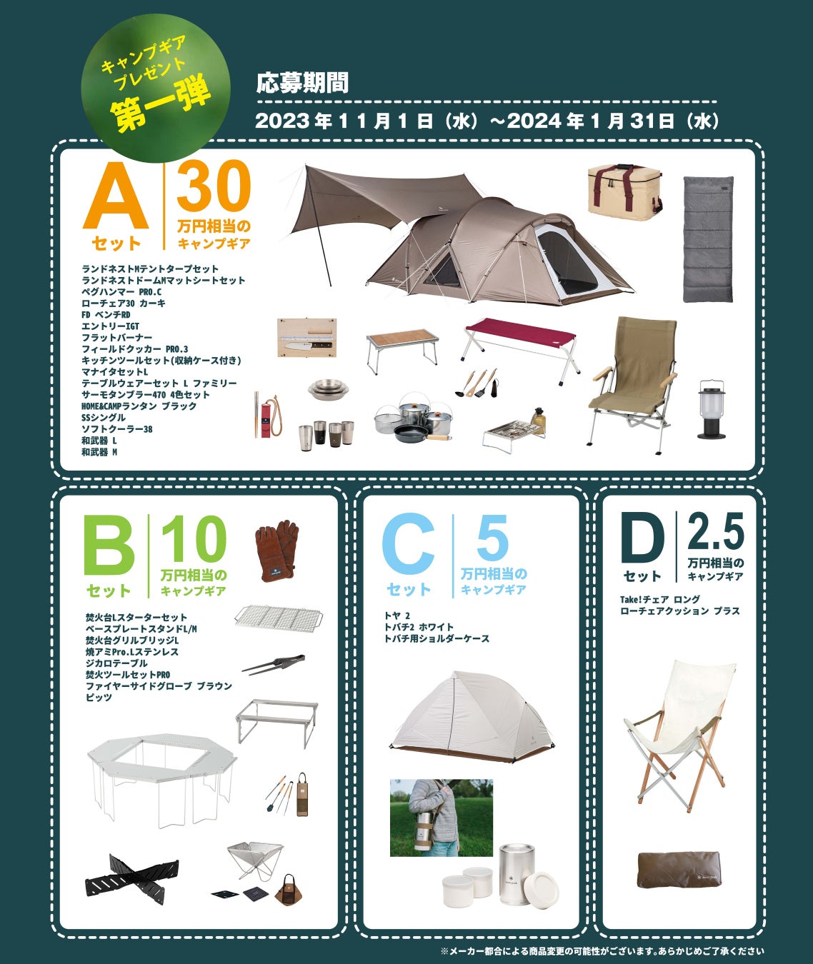 【キャンペーン内容】: 応募された方から抽選で4名様に、最高30万円相当のキャンプギアプレゼント