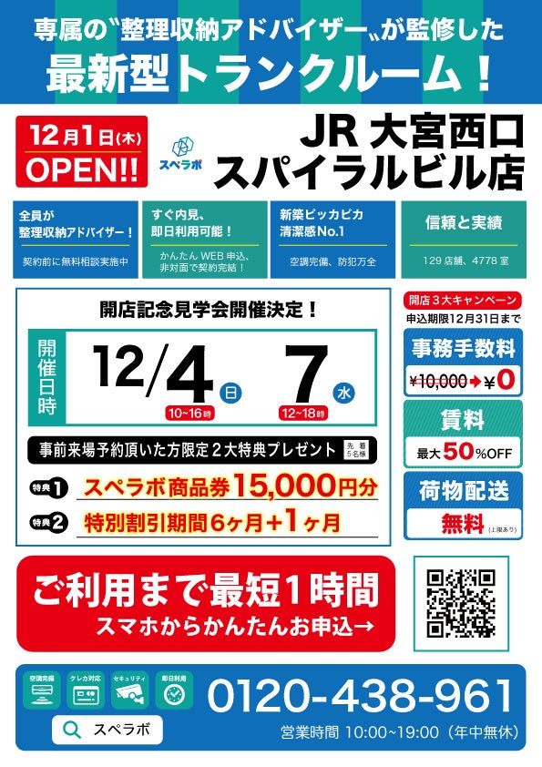 【12月1日(木)オープン】見学から契約、解約まで完全非接触・非対面、お申し込みからご利用まで最短1時間!都内、大阪などにて絶賛運営中のトランクルーム【スペラボ】が大宮西口スパイラルビル内に出店!