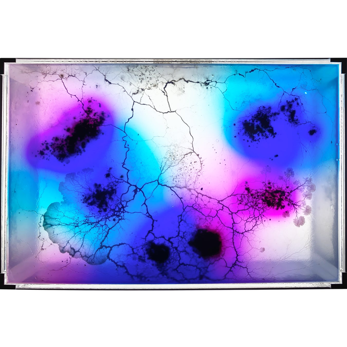 展示作品は、私が山で採取してきた粘菌に色素の含まれた餌を与えることによって生み出されるパターンを利用しており、人間の作者と粘菌の双方によって成り立ちます。