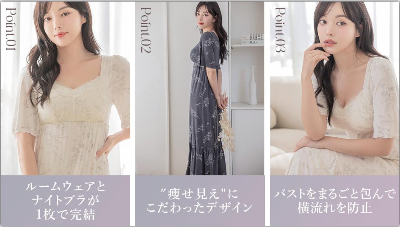 ナイトブラ一体型ワンピースの半袖タイプに今回は特に人気の高い『花柄デザイン』を採用し、春夏シーズンにぴったりの華やかなラインナップを展開します。