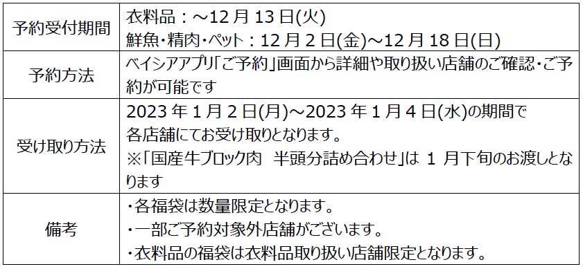 株式会社ベイシア(本社:群馬県前橋市、代表取締役社長:相木孝仁)は、ベイシアアプリにて2023年の年始に販売する福袋の予約販売を開始いたします。鮮魚や精肉など生鮮食品の福袋は12月2日(金)からご予約開始、50種以上にのぼる衣料品福袋は好評ご予約受付中です。店頭でのお渡しは1月2日(月)~4日(水)※一部商品を除く、いずれも数量限定商品となります。ぜひベイシアの福袋でハッピーな新年を迎えてみてはいかがでしょうか。