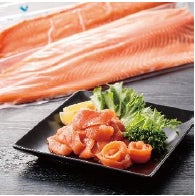 商品内容:刺身用生アトランティックサーモン(養殖)1枚(約1.3kg)、刺身用サーモントラウト(養殖)1枚(約800g)、生食用スモークサーモンカット(500g)