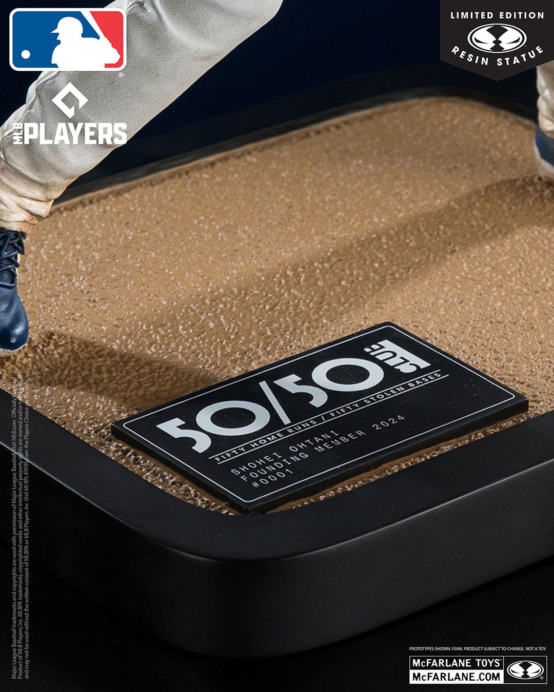 台座には、大谷選手の50-50(1シーズンで50本塁打と50盗塁)達成を祝した「50-50 CLUB」のプレートがデザインされています。
